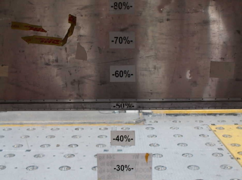 Lo que ven en la imagen es un ULD aéreo, típico de las grandes compañías integradoras, con su suelo rodante para la manipulación de la carga y con paredes transparentes para la visualización de los paquetes. Sobre una de las mamparas se observa impreso el “termómetro de capacidad”, que sirve para medir el nivel de llenado de cada contenedor. A veces, el cálculo de algo tan complejo requiere de soluciones así de sencillas.