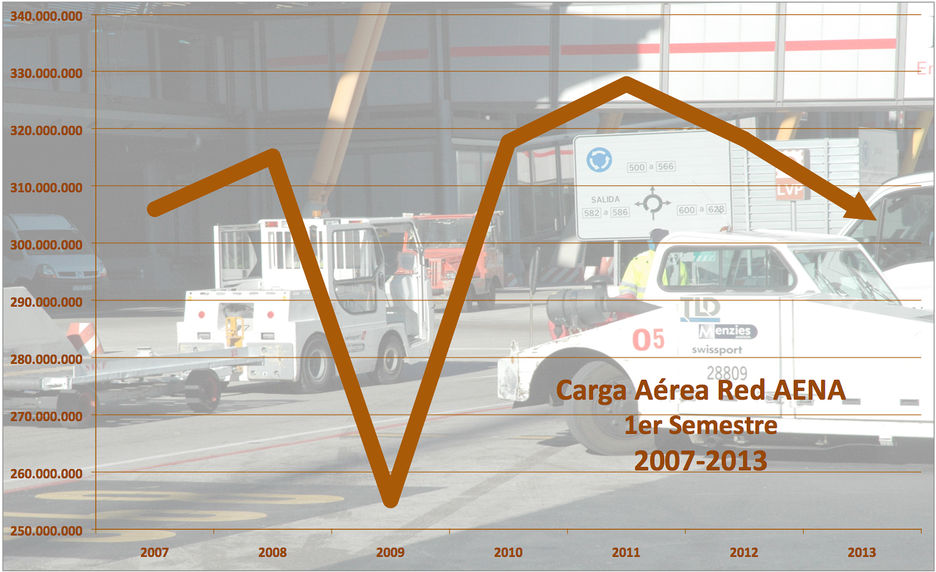 Los 305,56 millones de kilos que movieron los aeropuertos españoles en el primer semestre de 2013 están prácticamente al mismo nivel que los 306,01 millones que se movieron en igual periodo de 2007. Es decir, en estos momentos estaríamos en España con un tráfico de transporte aéreo de mercancías ante el que podríamos decir que parece que no ha pasado la crisis.Ahora bien, esta situación de estar en los niveles de 2007 se antoja muy negativa si tenemos en cuenta que se produce tras el hundimiento de 2009, el rebote espectacular de 2010 y el récord histórico de tráfico de mercancías de los aeropuertos españoles en 2011 con 327,8 millones de kilos en el primer semestre, que se antojan ya muy lejanos en este 2013, tras los sucesivos retrocesos de 2012 y el presente ejercicio.El sistema aeroportuario español está ahora mismo en clara fase negativa con un descenso de sus tráficos entre enero y junio con respecto a igual periodo de 2012 del 3,8%, merced a la compleja coyuntura del Aeropuerto de Madrid-Barajas, que con 165,52 millones de kilos retrocedió en el primer semestre un 6,9%.Mantienen el tipo el resto de grandes aeropuertos cargueros, como Barcelona (+2,7%), Zaragoza (+2,4%) y Vitoria (+9,6%).Con todo, el problema no sólo se circunscribe a Madrid, pues junio fue especialmente negativo en toda la red aeroportuaria, dando continuidad a un mes de mayo que tampoco fue bueno. Así, Madrid ya no es el único factor negativo si vemos los tráficos del último mes.Barajas cayó un 6% hasta los 27,28 millones de kilos, pero es que Barcelona retrocedió un 4,9% hasta los 7,9 millones y Zaragoza descendió un 10,8% y no superó los 5,79 millones.Del cuarteto de cabeza sólo creció en junio Vitoria, en concreto un 3%.La situación en los aeropuertos insulares en el primer semestre es muy negativa, con retrocesos destacados en Palma (-12,2%), Gran Canaria (-14%) o Tenerife N. (-10,4%).