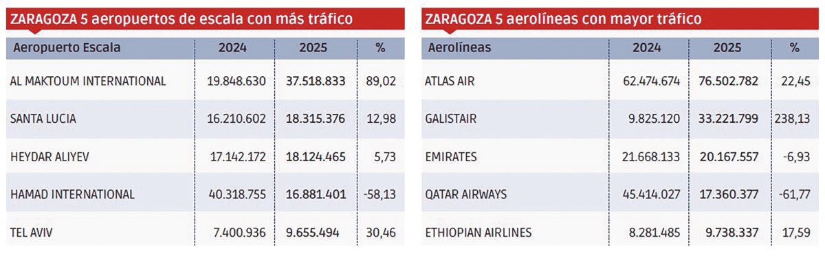 Fiel a los rediseños de las cadenas logísticas del gigante Inditex, el Aeropuerto de Zaragoza afrontó un 2025 en su primera mitad claramente a la baja, si bien a partir del verano los ...