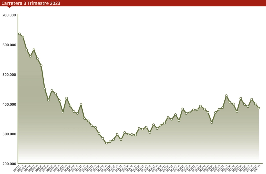 MADRID. En el tercer trimestre del año, según los datos del Ministerio de Transportes y Movilidad Sostenible, el transporte de mercancías por carretera movió 387.624 toneladas, lo que supone un descenso del 3,13% con respecto al tercer trimestre de 2022, cuando se movieron 400.134 toneladas.