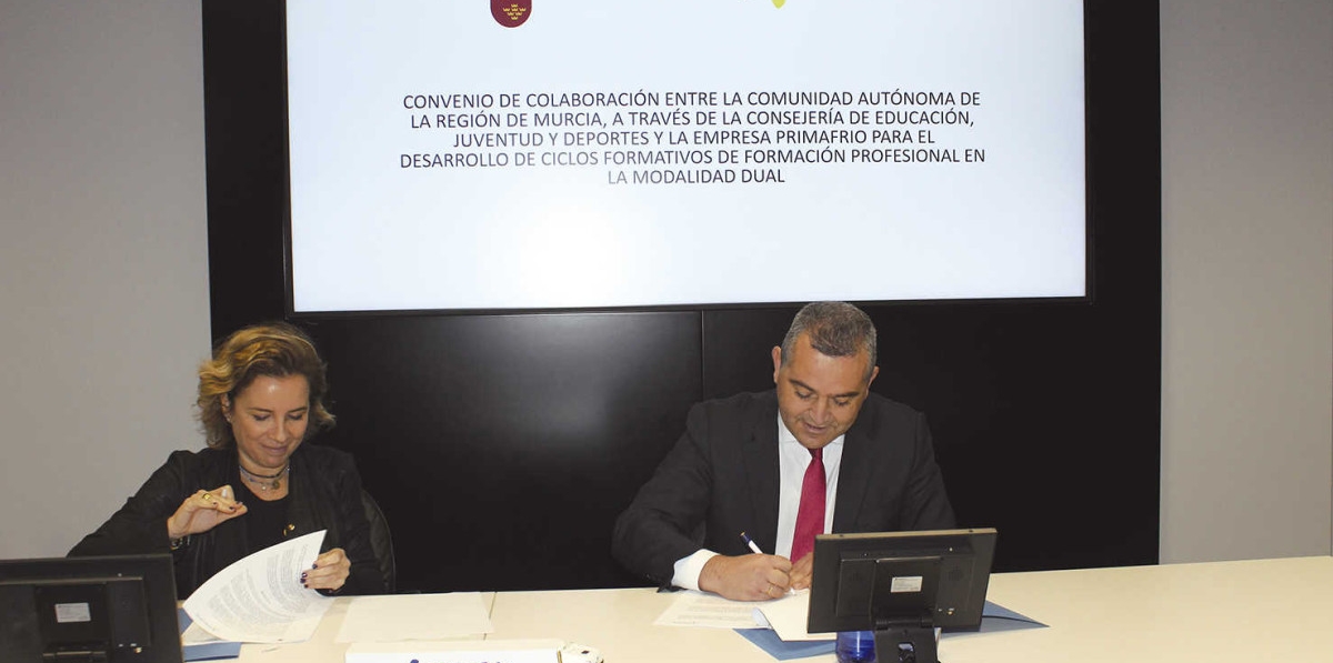 Ayer por la mañana la Consejera de Educación, Juventud y Deportes, Adela Martínez-Cachá, y el director general del Grupo Primafrio, Juan Ignacio Conesa, suscribieron un convenio por el que 10 alumnos del ciclo de Grado Superior de la Familia de Comercio Internacional y Transporte del IES La Florida de las Torres de Cotillas combinarán la asistencia al centro educativo con las prácticas en la empresa.
