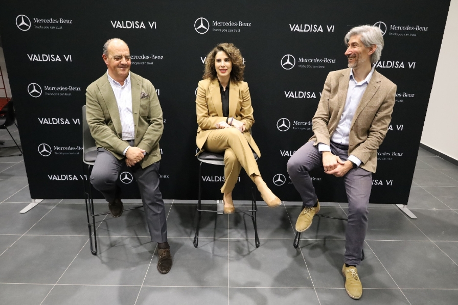 Antonio García-Patiño, CEO de Mercedes-Benz Trucks España y Portugal; Cristina Mora, alcaldesa de Quart de Poblet; y Mario Polo, gerente de Vehículos Industriales de Valdisa, durante la inauguración oficial de las nuevas instalaciones de Valdisa Vehículos Industriales. Foto R. T.