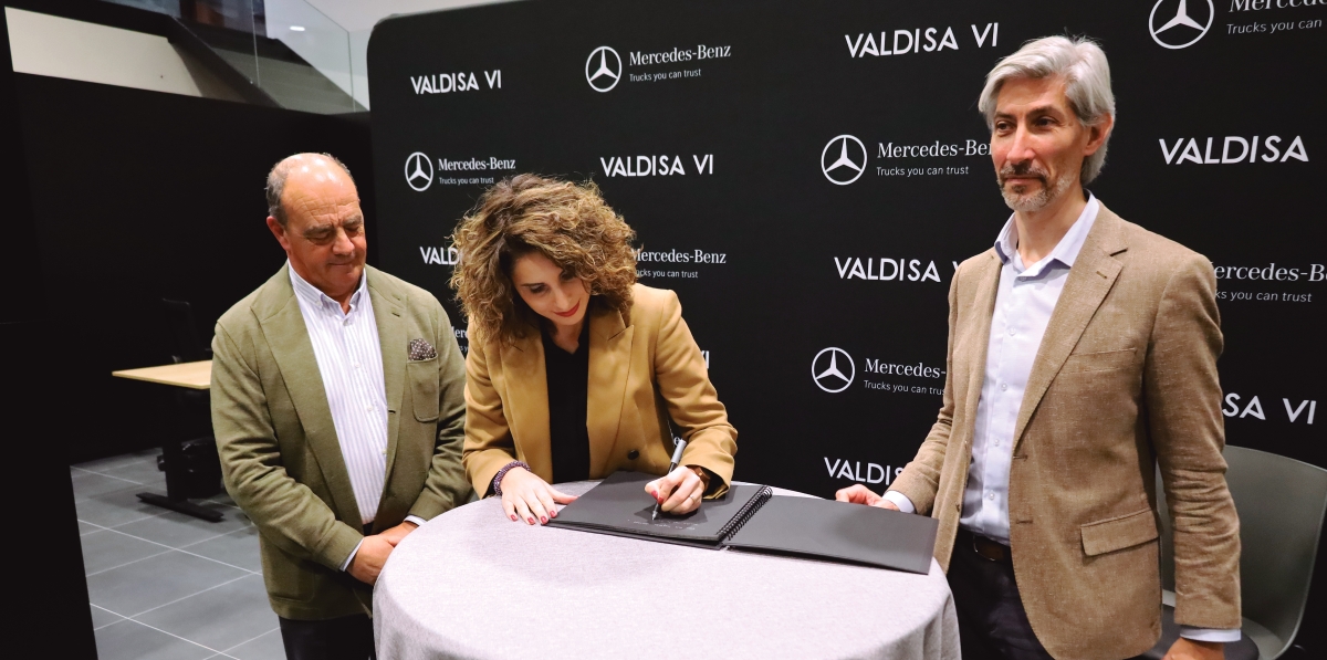 Antonio García-Patiño, CEO de Mercedes-Benz Trucks España y Portugal (izquierda); y Mario Polo, gerente de Vehículos Industriales de Valdisa (derecha), flanquean a Cristina Mora, alcaldesa de Quart de Poblet, durante la firma de la primera edil en el Libro de Honor el pasado jueves con motivo de la inauguración de las nuevas instalaciones de Valdisa VI en Quart de Poblet. Foto R. T.