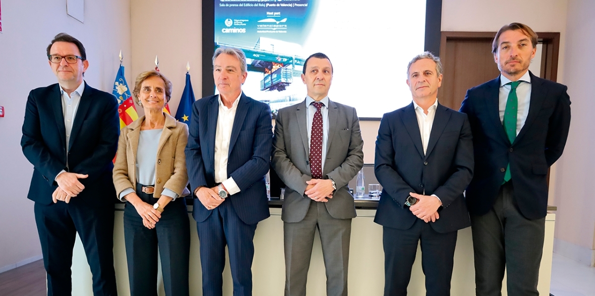 Ángel Casado, Business Development Manager Iberia, France & Magreb de VIIA; Juan Carlos Arocas, Managing Director Iberia de Trans Italia; Jesús Calvo, director general de Tramesa; Nuria Lacaci, secretaria general de ACE; Javier Jaso, responsable de Transporte de AECOC; y Pedro Catalán, general manager de CSP Logitren, durante la mesa redonda de la jornada organizada ayer por el Colegio de Ingenieros, Caminos, Canales y Puertos de la Comunitat Valenciana en el Edificio del Reloj del Puerto de Valencia. Foto R. T.