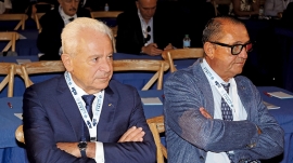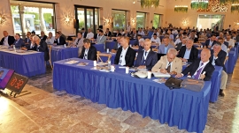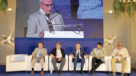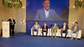 Miembros de la segunda mesa de debate de la segunda jornada del 8º Congreso de ATFRIE. Sentados: José Antonio Rubio, vocal de la Junta Directiva de ATFRIE; Pierre García, alto funcionario honorario del Ministerio de Trabajo de Francia; Roberto Parrillo, expresidente de ETF; Francisco Vegas, secretario de Carreteras y Logísticas de CCOO; y Diego Buenestado, secretario de Carreteras de UGT. En la pantalla, Pedro Conejero, vicepresidente de ATFRIE. Foto R. T.