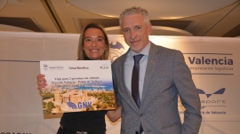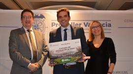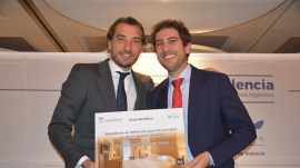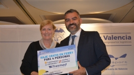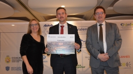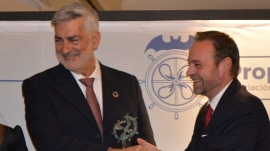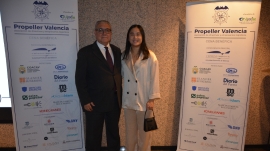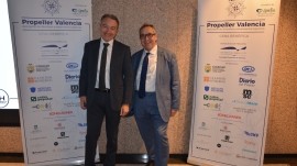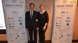 Francisco Prado, presidente de Aportem-Puerto Solidario Valencia, recibe la distinción Propeller Valencia 2025 de manos del presidente de Propeller Valencia, Alfredo Soler. Foto J.C.P.