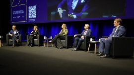 Iván Jiménez, presidente de la Autoridad Portuaria de Bilbao; Lidia Muñoz, directora de Puertos y Aeropuertos de Indra; Elena García, directora Área de Consultoría y Desarrollo en Brain & Code; Francisco Toledo, director de la Cátedra Smart Ports en la Universitat Jaume I; y Óscar Pernía, co-founder & Chief Technology Officer (CTO) de NextPort.ai. Foto R. T.