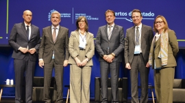 Gerardo Landaluce, presidente de la Autoridad Portuaria de la Bahía de Algeciras; Benito Núñez, secretario general de Transportes Aéreo y Marítimo del Ministerio de Transportes y Movilidad Sostenible; Miguel Otero, investigador principal en el Real Instituto Elcano; Miguel Ballenilla, teniente general y director del Centro Superior de Estudios de la Defensa Nacional (CESEDEN); y Pablo Conde, director general de Desarrollo de Negocio Internacional de ICEX. Foto R. T.
