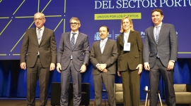 Martín Fernández, presidente de Autoridad Portuaria de A Coruña; Antonio Bordils, CEO de Boluda Corporación Marítima y vicepresidente de ANARE; Francisco Peleteiro, secretario general de la Asociación Española de Empresas de Amarre (AEEA); Antonio Sabor, vicepresidente del Colegio Oficial Nacional de Prácticos de Puerto; y José Luis Romero, secretario general de la Asociación Nacional de Empresas Estibadoras (ANESCO). Foto R. T.