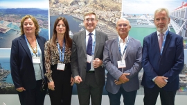 El presidente del Puerto de Málaga, Carlos Rubio, junto con May Bond, Group Director de Seatrade, y Figen Ayan, presidenta de MedCruise, y otros respresentantes de la comunidad portuaria española, ayer durante la presentación de Seatrade Cruise Med 2024. Foto B.C.