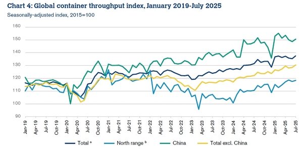 En la primera mitad de 2025, el tráfico mundial de contenedores aumentó un 6% interanual, con un crecimiento sólido del 7,4% en el índice del Norte de Europa, que abarca a los puertos de Le Havre, Zeebrugge, Amberes, Róterdam, Bremen/Bremerhaven y Hamburgo. La actividad portuaria china creció un 6,1%, con su índice alcanzando 150,6 en julio, lo que indica una recuperación de las exportaciones chinas. Los datos mensuales más recientes muestran un aumento del tráfico de contenedores en todas las demás regiones portuarias también.