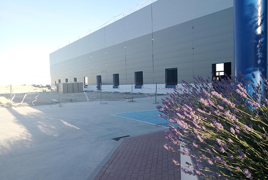 La plataforma está dotada de parking para los vehículos de los trabajadores y clientes con plazas habilitadas para coches eléctricos, parking para vehículos pesados, garita de seguridad para accesos y zonas comunes ajardinadas para el descanso del personal.