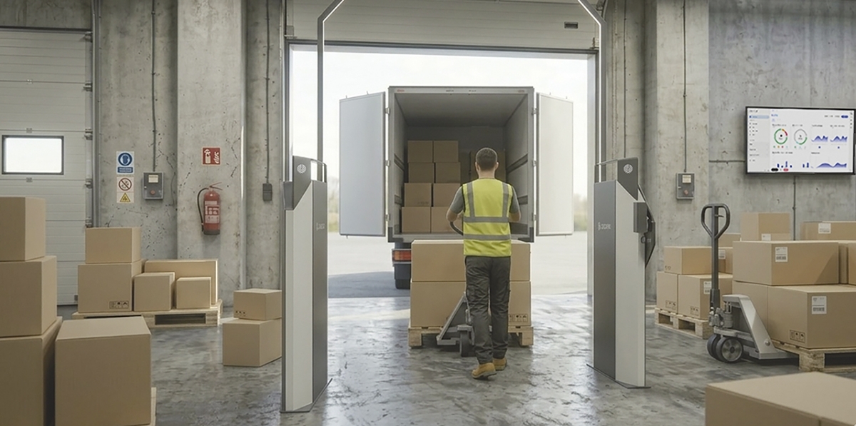 La lectura se produce mientras pallets o cajas atraviesan el muelle, y la información se transmite automáticamente a los sistemas de gestión del almacén.