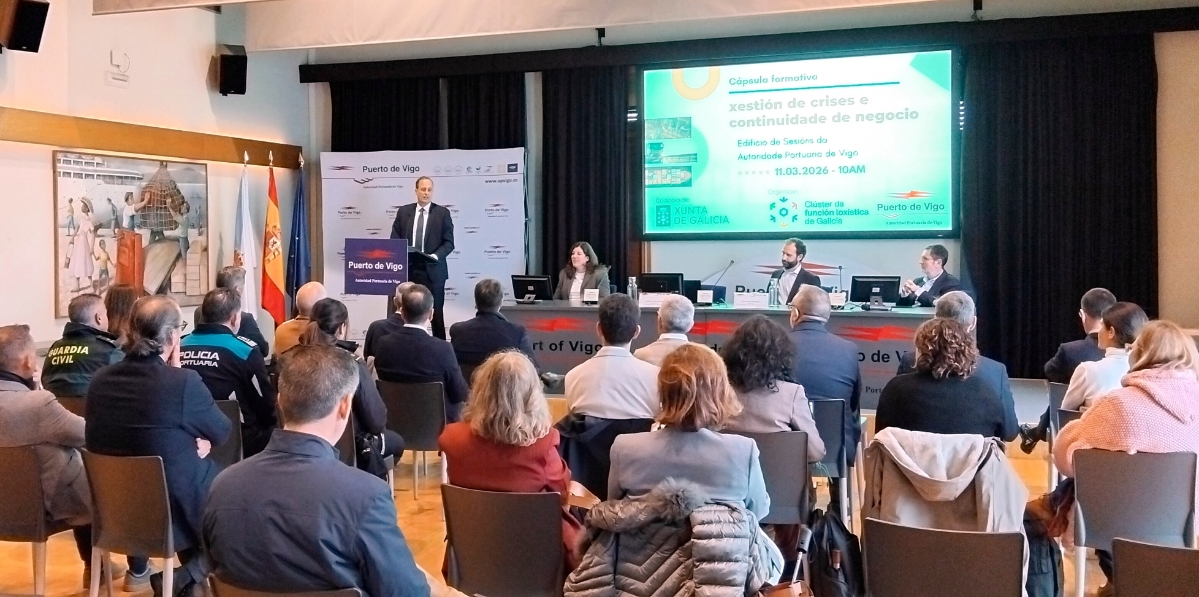 El Clúster da Función Loxística de Galicia y la Autoridad Portuaria de Vigo han celebrado este miércoles en el Edificio de Sesiones II Cápsula Formativa sobre Gestión de Crisis y Continuidad de Negocio, dirigida a empresas asociadas al Clúster y a miembros del ecosistema portuario vigués.