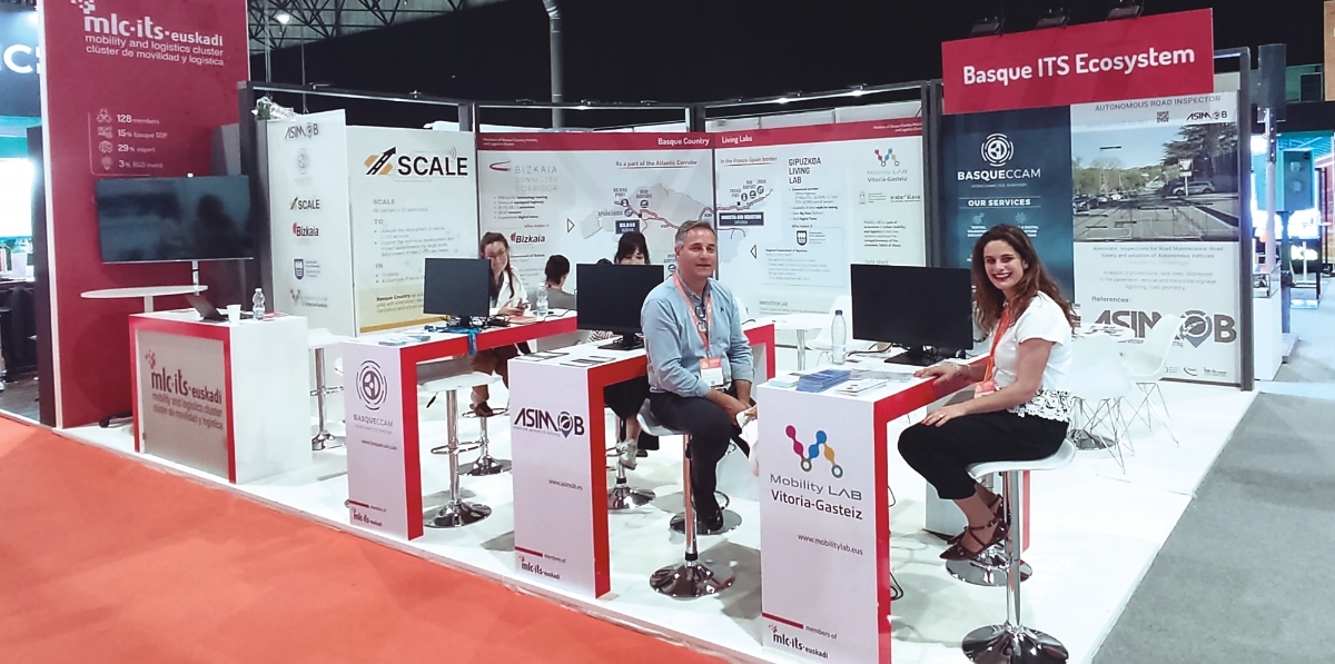 En el stand conjunto exhibían sus soluciones Asimob, que acudía con su inspector autónomo de carreteras. Basque CCAM mostraba sus servicios en movilidad conectada, cooperativa y autónoma en cuanto a testeo, validación y despliegue, herramientas de pruebas, infraestructuras físicas y digitales, gestión y proceso de datos y consultoría. La Fundación Mobility Lab Vitoria-Gasteiz se presentaba como polo de innovación en movilidad y logística urbana y plataforma de pruebas. Y las diputaciones de Bizkaia y Gipuzkoa daban a conocer sus respectivos corredores conectados, en total, más de 1.300 km de infraestructuras para testeo de tecnologías. En cuanto al proyecto Scale, casi 70 partners trabajan en él para avanzar en el despliegue de sistemas C-ITS cooperativos.
