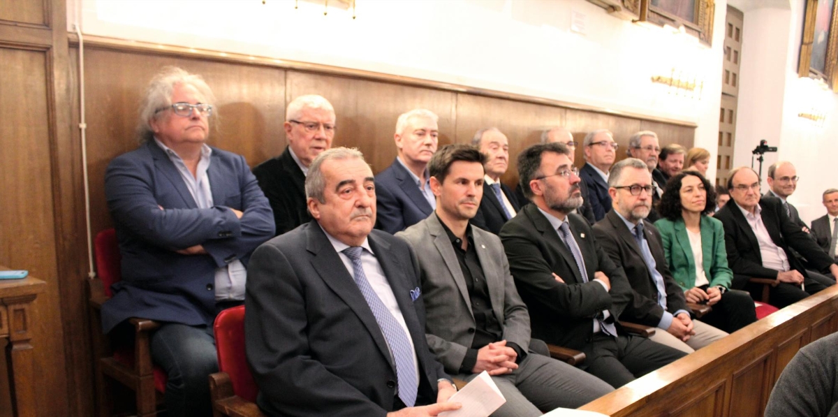 En primera fila, Emili Sanz, presidente de ATEIA-OLTRA; Oriol Martori, director general de Transports y Mobilitat de la Generalitat de Catalunya; Lluís Salvadó, presidente de Port de Barcelona; Saül Garreta, presidente de la AP Tarragona; y Sonia Corrochano, directora del Aeropuerto de Barcelona-El Prat. Tras ellos, los presidentes y representantes de las asociaciones sectoriales. Foto J.C.S.