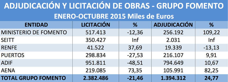 De acuerdo con los últimos datos hechos públicos por el Ministerio de Fomento, entre enero y octubre de 2015 el Grupo Fomento licitó obras por valor de 2.382 millones de euros, lo que representa un retroceso con respecto al mismo periodo de 2014 del 21,46%.La mayor caída la registra Adif, que en este periodo redujo la licitación un 48,5% hasta los 951,8 millones de euros.Además, también retrocedió de forma importante la licitación de obras por parte de las autoridades portuarias, en este periodo reducida a 298,8 millones de euros, lo que implica una caída del 27,5%.También retrocedió la licitación del Ministerio de Fomento, principalmente volcada en carreteras, registrándose un ratio negativo de 12,3% con 517,4 millones. La licitación de la Dirección General de Carreteras cayó un 15,8%. Entre enero y octubre sólo creció la licitación de obras en Renfe (+37,3% con 41,5 millones) y de forma destacada en AENA, con un incremento del 73,3% hasta alcanzar los 219 millones de euros licitados en obras.AdjudicaciónEn cuanto a la adjudicación de obra pública, el devenir fue totalmente distinto hasta octubre de 2015. En concreto, desde enero, el Grupo Fomento adjudicó obras por valor de 1.394,3 millones de euros, lo que representa un crecimiento del 24,7% con respecto al mismo periodo de 2014.La evolución más destacada fue, sin duda, la del propio Ministerio de Fomento, con un incremento del 109% en la adjudicación al otorgarse obras por valor de 256,1 millones de euros.Esta relevante aceleración fue fruto principalmente de las inversiones de la Dirección General de Carreteras en esta materia.También hasta octubre destacó el incremento en la adjudicación de AENA, que creció un 82,2% hasta los 105,9 millones de euros, así como los 794,6 millones adjudicados en obras por Adif, lo que elevó el incremento al 10,6%.Igualmente, las adjudicaciones en obras de las autoridades portuarias ascendieron a 216,1 millones de euros, lo que representó un crecimiento del 9,9%.OctubrePor lo que respecta al comportamiento de las adjudicaciones y licitaciones en el mes de octubre, fue totalmente a la inversa que en el conjunto del año.En concreto, las adjudicaciones de obras del Grupo Fomento cayeron en octubre un 68,7%, con descensos notables y generalizados: AENA (-20,1%), Adif (-83,4%), Puertos (-60%) y Renfe (-60%).Mientras, las licitaciones crecieron en octubre un 8,47%, debido esencialmente a los 246,8 millones de euros licitados por la SEITT, ya que la licitación de Adif cayó un 71,8% y la de Puertos un 21,6%.La licitación de obras por AENA en octubre se multiplicó casi por ocho hasta los 23,9 millones de euros.