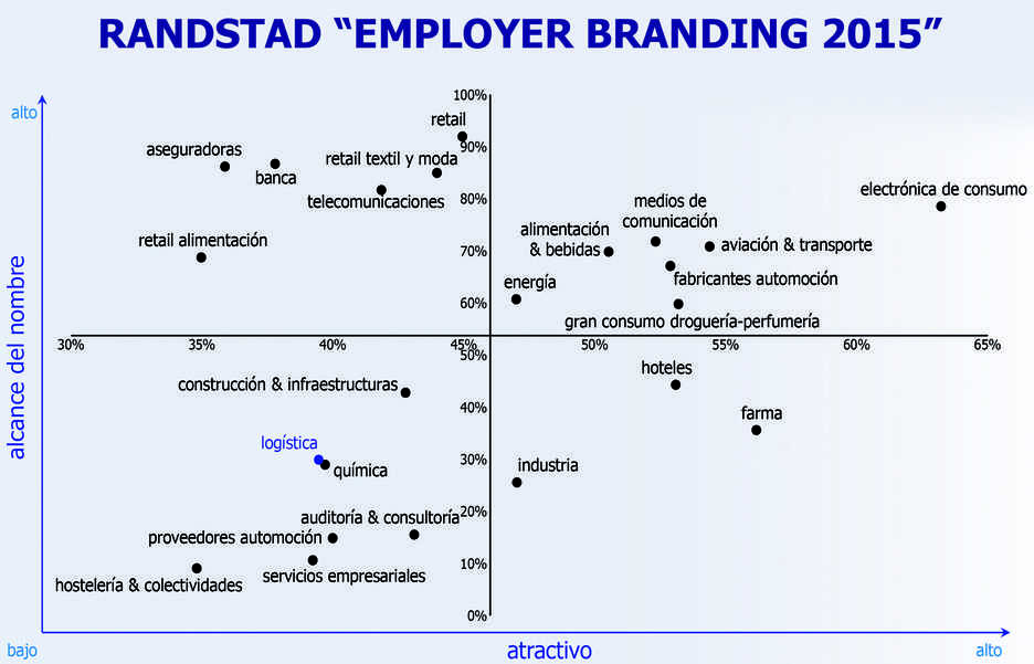 Con 191 empresas como referente del estudio y un total de 11.900 entrevistas a trabajadores y trabajadoras, Randstad ha analizado las razones esenciales que llevan a un trabajador a elegir un puesto de trabajo, así como la valoración que tienen estos de las principales compañías empleadoras de España y de los sectores a las que pertenecen.En este contexto, Randstad ha analizado en qué medida son atractivos los distintos sectores profesionales en España, concluyendo que en el caso de la logística la situación es bastante pobre y que, además, está empeorando.Por lo que se refiere al alcance del nombre y al reconocimiento de la marca de las principales empresas logísticas que operan en España, en 2015 apenas el 30% de los encuestados ha contestado afirmativamente y señalado que conoce estas compañías.Si tenemos en cuenta que el reconocimiento medio de todas las empresas objeto de estudio ha sido el 60%, constataremos el pobre nivel de imagen que poseen las empresas logísticas.Por si esto fuera poco, precisamente en lo que respecta al atractivo que generan estas empresas y el conjunto del sector para trabajar en él, el estudio otorga apenas un 39% de respuestas de empleados que querrían trabajar en este ámbito, también por debajo de la media del 44% que se obtiene para el conjunto de sectores.Dicho esto, el sector logístico ha sufrido un claro retroceso en este último estudio cayendo por debajo del nivel de hace dos años.En 2014 el reconocimiento de los nombres de las empresas logísticas era del 37%, siete puntos más que en 2015. Además, en 2013 era del 34%, es decir, cuatro puntos menos. En cuanto al atractivo, se ha bajado un punto, ya que en 2014 las respuestas afirmativas habían sido un 40%.Esto da como resultado que el sector de la logística esté claramente encuadrado entre los sectores de bajo atractivo y de bajo alcance del nombre de sus empresas, considerándose estas de “bajo perfil”, con una elección muy limitada por parte de empleados potenciales y con acogida principalmente entre aquellos menos cualificados y menos motivados.En situación similar al sector logístico se encuentran los sectores de la química, la consultoría, la hostelería, los servicios empresariales y los proveedores de automoción.En la situación totalmente contraria se encuentran, de acuerdo con el estudio de Randstad, sectores como la electrónica de gran consumo, los fabricantes de automoción, la aviación, el sector de la alimentación y las bebidas o los medios de comunicación.En este caso hablamos de sectores altamente reconocidos y altamente atractivos que pueden elegir entre una amplia variedad de empleados potenciales altamente cualificados y motivados.