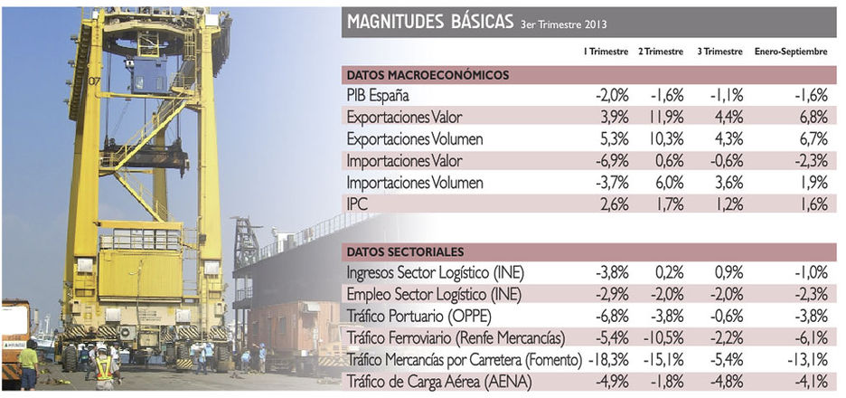 Según el Ministerio de Economía, el PIB de España creció un 0,1% en el tercer trimestre del año con respecto al trimestre anterior. Su puso fin así a diez trimestres consecutivos de caída de la economía española, alimentando el mensaje gubernamental de que el cambio en la economía ha comenzado por fin a producirse.Ahora bien, a simple vista los datos generales poco o nada dicen al respecto. En el tercer trimestre de 2013, con respecto al mismo periodo de 2012, el PIB se situó un 1,1% por debajo. Bien es cierto que el retroceso en el primer trimestre fue del 2,6% y en el segundo del 1,6%, es decir, se ha venido produciendo una clara ralentización del retroceso para dejar el crecimiento acumulado del PIB entre enero y septiembre en el -1,6%. El dato es significativo si lo unimos al crecimiento intertrimestral citado del +0,1%, pero se antoja claramente insuficiente para lanzar las campanas al vuelo.Es relevante que en este cambio de tendencia parece estabilizarse el consumo interno, como pone de manifiesto el siempre revelador dato de las importaciones. Tras el fuerte retroceso de las mismas en valor en el primer trimestre (-6,9%), crecieron un 0,6% en el segundo y descendieron un 0,6% en el tercero, es decir, se ha logrado a este respecto una clara estabilización. Por si esto fuera poco, en volumen las importaciones, que habían caído un 3,7% en el arranque del año, se incrementaron un 6% en el segundo trimestre y, lo que es más importante, se mantuvieron al alza con un +3,6% en el tercero, para cerrar el periodo enero-septiembre en positivo: +1,9%.Además, las exportaciones siguen sin variar un ápice su solidez. En el tercer trimestre del año crecieron un 4,4% en valor y un 4,3% en volumen y si bien no estuvieron en la línea de los dos dígitos del segundo trimestre sí prosiguieron su crecimiento para cerrar el periodo enero-septiembre con un incremento del 6,8% en valor y del 6,7% en volumen, reafirmándose como el factor más sólido de nuestra economía.Con todo, esto no sirve para revitalizar de forma contundente el sector logístico, que en el tercer trimestre siguió mejorando en ingresos pero tenuemente hasta dejar la caída en el 1%, mientras que en actividad y tráficos se mantuvieron los retrocesos.En el caso del transporte por carretera, la caída estuvo lejos del 18% y del 15% de los primeros trimestres, pero en el tercer trimestre siguió siendo significativa: -5,4%.En cuanto al transporte marítimo, los puertos españoles esbozaron en agosto una anunciada recuperación que quedó en nada para cerrar el trimestre en -0,6% y dejar el acumulado en el -3,8%El transporte ferroviario también ralentizó el descenso de las toneladas transportadas (-2,2%), si bien por vez primera en lo que va de año las toneladas-kilómetro se situaron en negativo.Por último, el transporte aéreo volvió a los niveles del primer trimestre con una caída del 4,8% en los tráficos de carga aérea lo que volvió a elevar el descenso acumulado al 4,1%.