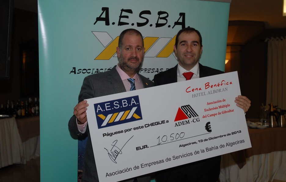 El presidente de AESBA, Manuel Piedra entregó al máximo responsable de dicha asociación, Javier Cózar, un cheque simbólico por valor de 10.500 euros. Sin embargo, a lo largo de la noche varias personas a nivel particular, así como empresas, estuvieron comprando cubiertos para la mesa cero. Entre otras, las aportaciones de Mecametal, Gas Marine, Lia Oil, Actividad Consultoria, TransPiedra y sobre todo CLH, hicieron posible que al final se incrementara la cantidad recaudada, ascendiendo a más de 10.700 euros. Desde hace tres años, la tradicional cena navideña de las empresas marítimo portuarias se convierte en un acto benéfico a favor de una asociación o una ONG del Campo de Gibraltar. En esta ocasión, se quiso reconocer la labor que desde la sede de ADEM-CG de La Línea se viene realizando para mejorar en la comarca la calidad de vida y el bienestar social de los afectados de Esclerosis Múltiple, una enfermedad neurológica que afecta al sistema nervioso central.