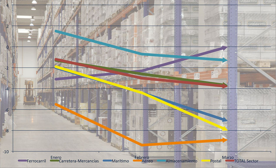 El sector del Transporte y Almacenamiento, tal y como lo conceptúa el INE, redujo su cifra de negocios en el primer trimestre con respecto a igual periodo de 2012 un 3,8%, caída agravada por los malos resultados de marzo.El único subsector que no cerró el primer trimestre en negativo fue el transporte ferroviario, con crecimiento 0. En el resto, las cifras siguieron transmitiendo síntomas preocupantes.Entre enero y marzo de 2013, el transporte de mercancías por carretera retrocedió en su cifra de negocios un 3,7%, el segundo mejor ratio de todos los subsectores en negativo tras el -1,3% del subsector del almacenamiento y las actividades anexas al transporte, por cierto, el único que había comenzado el año en positivo. Por lo demás, el transporte aéreo vio disminuir su cifra de negocios en el primer trimestre un 8,9%, mientras que el sector postal retrocedió un 8%. Es muy destacable la mala evolución del transporte marítimo, que cayó en el primer trimestre en cifra de negocios un 7,1%, según el INE.Hay que precisar, tal y como se ha señalado, que marzo puso la guinda al trimestre con un retroceso sectorial del 6,1% frente al mismo mes de 2012. El transporte aéreo redujo su cifra de negocios en este mes un 8%, el marítimo un 11,4% y el sector del almacenamiento y actividades anexas al transporte un 3,7%. Destaca igualmente la negativa evolución en marzo del transporte de mercancías por carretera, que redujo su cifra de negocios un 6,7%, lo que da una idea del peso de este mes en el conjunto del trimestre.EmpleoPor lo que respecta al empleo en el sector logístico, los índices de ocupación por ramas de actividad en el sector del Transporte y Almacenamiento fueron de la mano en el primer trimestre de la cifra de negocios, como se ha dicho claramente negativa. Entre enero y marzo de 2013 en el conjunto del sector del transporte la ocupación laboral se redujo un 2,9%.Por subsectores, lo más llamativo es la situación del transporte marítimo, donde el empleo cayó en el primer trimestre un 10,4%, lo que supone un ratio muy notable. Sólo en marzo el descenso fue del 8,7%. El empleo en el sector del transporte aéreo retrocedió un 3,5%, mientras que en el transporte ferroviario fue del 0,9%. En el sector del transporte de mercancías por carretera el descenso se situó en el -3,1%. Por su parte, en el ámbito del almacenamiento y las actividades anexas al transporte el índice de ocupación cayó en el primer trimestre un 2,4%. La segunda caída más relevante en la ocupación en el primer trimestre fue la de las actividades postales y de correo, con una reducción del 4,4%.