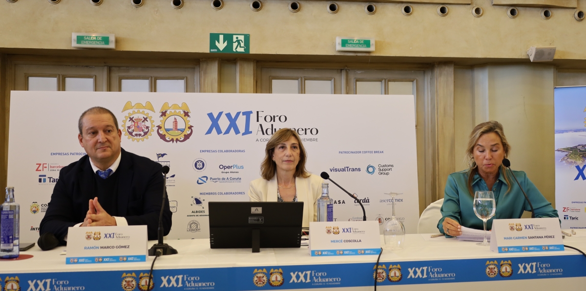 Ramón Marco Gómez, responsable de innovación del Colegio Oficial de Agentes de Aduanas y Representantes Aduaneros de Barcelona, Mercè Coscolla, directora del Colegio Oficial de Agentes de Aduanas y Representantes Aduaneros de Barcelona, y Mari Carmen Santana Pérez, presidenta del Colegio Oficial de Agentes de Aduanas y Representantes Aduaneros de Las Palmas, durante su presentación en el XXI Foro Aduanero. Foto: J. M.
