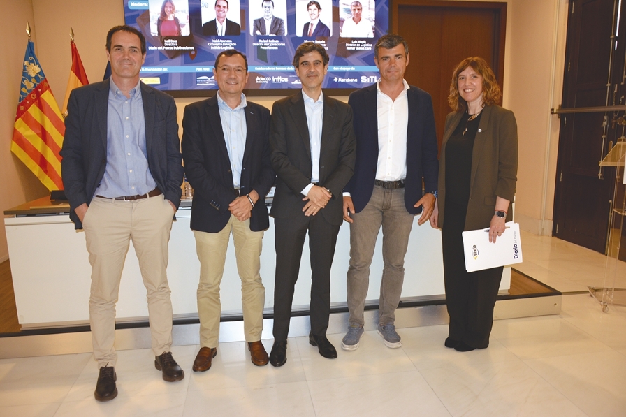Xabi Azarloza, consejero delegado de In Side Logistics; Rafael Salinas, director de Operaciones de Porcelanosa; Vicente Boluda, Associate Director Industrial & Logistics de Savills, Luis Magía, director de Logística de Grupo Romar Global Care y Loli Dolz, directora de Diario del Puerto Publicaciones. Foto J.C.P.