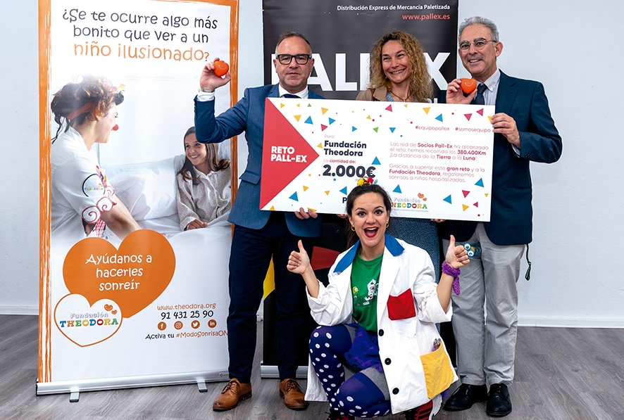 Tras lograr el reto propuesto, Andrés González, director Comercial y de Desarrollo de Negocio de Pall-Ex Iberia, ha entregado un talón por valor de 2.000 euros a Fernando Nájera, director de Fundraising y Mar Somoza, directora de Comunicación de Fundación Theodora, en un acto al que también asistió la Doctora Violeta, una de las Doctoras Sonrisa de la Fundación.