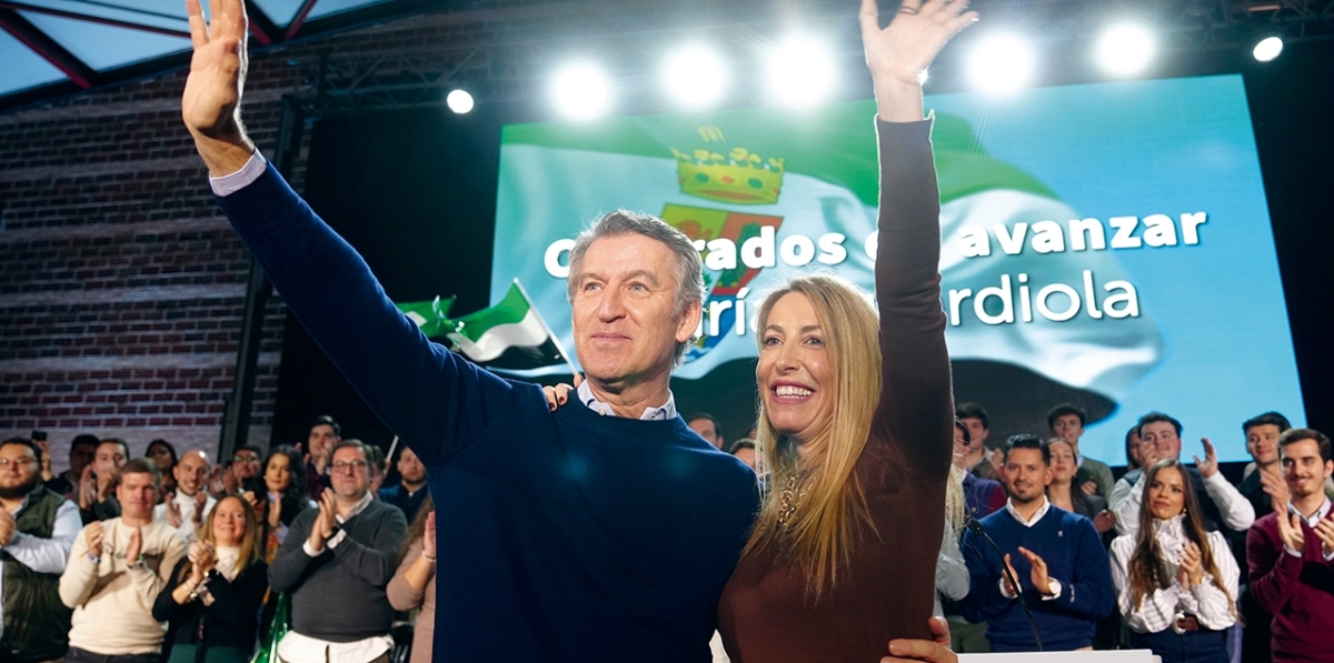 Alberto Núñez Feijoo, presidente del PP, junto a la candidata a la presidencia de la Junta, María Guardiola.