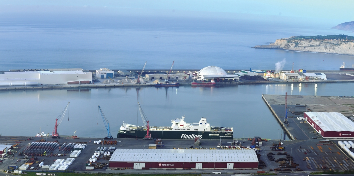 En primer término, instalaciones de Consignaciones Toro y Betolaza en el Puerto de Bilbao, con un barco de Finnlines.