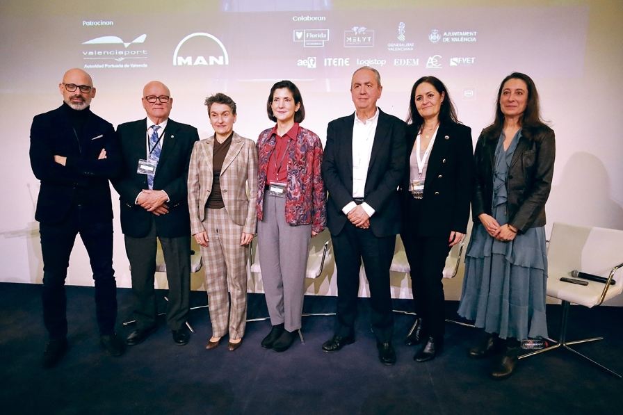 Juan Bueno (Moeve Consulting), Manuel Ríos (Generalitat Valenciana), Mar Chao (Autoridad Portuaria de Valencia), Beatriz Martínez-Florez (MAN), Gabino Diego (Foro de Logística), Mariló Peris (Foro de Logística), y Myriam Torrecilla (MAN). Foto R. T.
