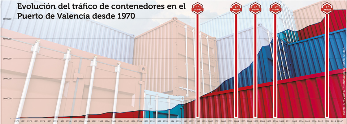 Para todos aquellos que no confían en la verdad del sector, hablemos de los datos estadísticos. Esos que custodia Puertos del Estado y que confirman la vertiginosa evolución del Puerto de Valencia desde la llegada de los primeros contenedores, la apuesta privada por este tipo de tráfico y la inevitable evidencia de que los pioneros del contenedor (José Luis Vilar, director de la Junta de Obras del Puerto de Valencia, y Perfecto Palacio, presidente de Marítima Valenciana) sabían lo que hacían.