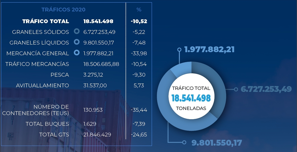 Esto supuso para la dársena de El Grao perder algo más de dos millones de toneladas provocado, en parte, por la caída del movimiento de mercancía general, que bajó un 33,98%, influido a su vez por la pérdida de 71.875 TEUs (-35,44% respecto 2019). El tráfico de graneles también se vio afectado: mientras que los sólidos bajaron un 5,22%, los líquidos lo hicieron casi siete puntos y medio.