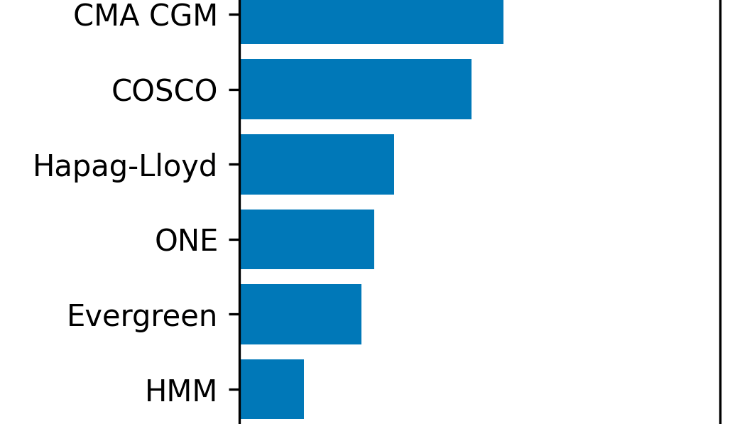 Las diez principales navieras concentran el 84% de la capacidad total, lo que refuerza el carácter oligopolístico del sector. MSC consolida su liderazgo mundial con alrededor de 7,1 millones de TEUs, equivalentes a algo más del 21% de cuota de mercado, ampliando la distancia respecto a sus competidores. Maersk ocupa la segunda posición con unos 4,6 millones de TEUs, seguida por CMA CGM, que supera los 4,1 millones de TEUs. El segundo bloque lo forman COSCO Shipping (3,6 millones de TEUs), Hapag-Lloyd (2,4 millones) y ONE (2,1 millones), mientras que Evergreen se aproxima a los 1,9 millones de TEUs. Cierran el Top 10 HMM, Yang Ming y ZIM, todas con flotas inferiores al millón de TEUs, pero con un peso relevante en determinados tráficos regionales.