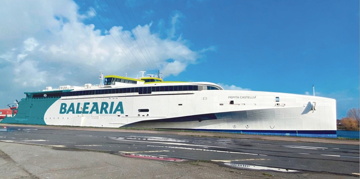 DENIA. El trimarán, que amplía la flota de alta velocidad de Baleària, tiene 102 metros de eslora y 27 metros de manga, con capacidad para 870 pasajeros y 250 vehículos, además de 190 metros lineales para carga, y puede alcanzar una velocidad de 35 nudos.
