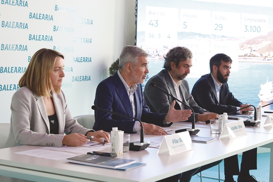 Un momento de la presentación del Informe de Sostenibilidad de 2025 de Baleària. De izquierda a derecha: Pilar Boix, directora de Comunicación de Baleària; Adolfo Utor, presidente de Baleària; Georges Bassoul, director general de la compañía; y Guillermo Utor, vicepresidente. Foto R. T.