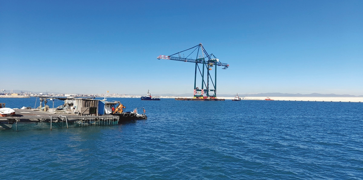 Las maniobras de traslado de la grúa desde la pontona al muelle ya han comenzado con los trabajos de lastre. En el transporte han colaborado tanto Remolcadores Boluda como Amarradores del Puerto de Valencia.