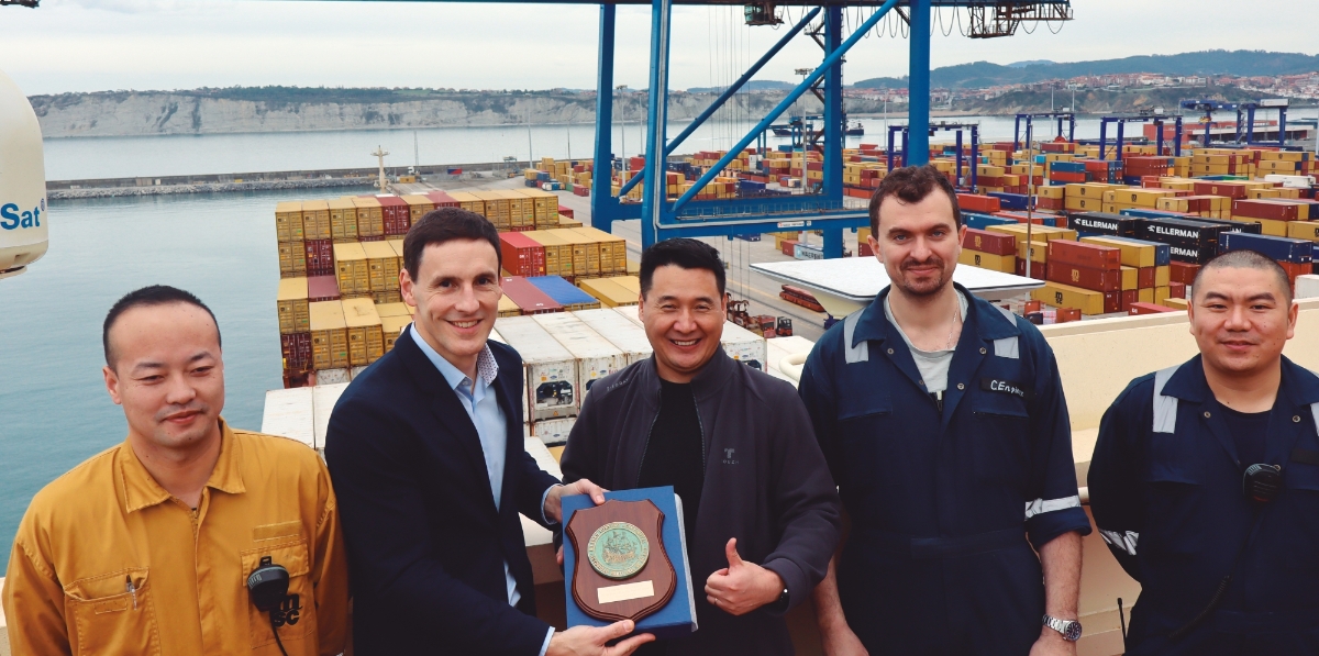 El director de Operaciones, Comercial y Logística de la Autoridad Portuaria de Bilbao, Andima Ormaetxe, ha hecho entrega este viernes al capitán del “MSC Yang R”, Dongzhen Bo, de una metopa conmemorativa en presencia de varios miembros de la tripulación. Foto J.P.