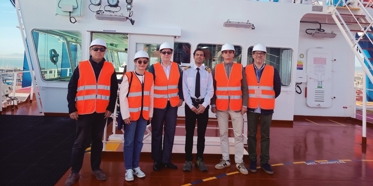 Miguel Marín, Sales and Marketing Manager de CSP Spain; Mar Chao, presidenta de la Autoridad Portuaria de Valencia; Esther Visiedo, managing director de Yang Ming Valencia; Pravesh Jauhar, capitán del “YM Willpower”; Andrés Camarasa, Sales manager de Yang Ming Valencia; y Francisco García, Operations manager de Yang Ming Valencia; durante la visita a bordo.