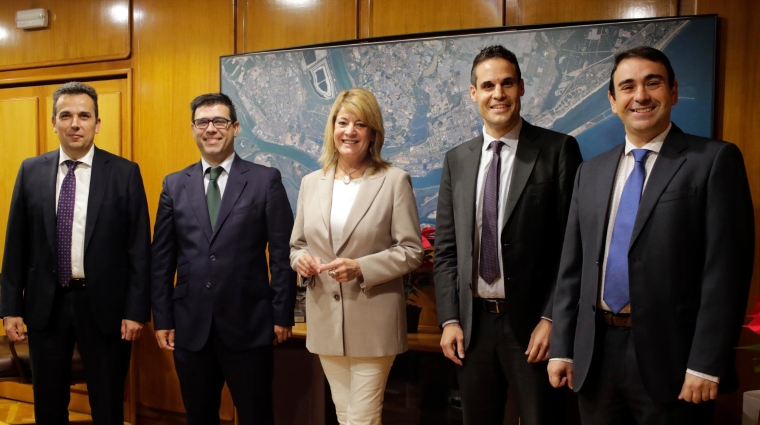 La presidenta del Puerto de Huelva, Pilar Miranda, ha recibido la visita del presidente del Grupo Amper, Pedro Morenés y del director general de Nervión Naval Offshore (empresa del grupo Amper), Roberto Bouzas, junto al director del puerto onubense, Ignacio Álvarez-Ossorio en un encuentro en el que los representantes del Grupo Amper han transmitido su interés en desarrollar este tipo de infraestructuras en el puerto onubense.