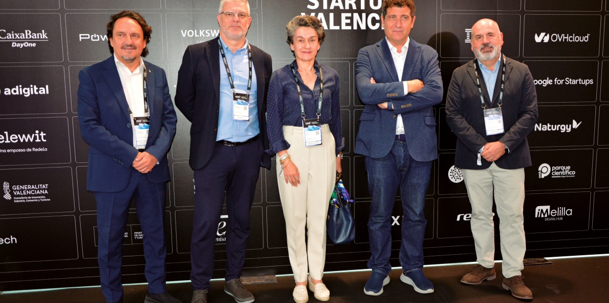 Antonio Torregrosa, director de la Fundación Valenciaport; Juan Luis Hortelano, presidente de Startup Valencia; Mar Chao, presidenta de la Autoridad Portuaria de Valencia; Nacho Mas, CEO de Startup Valencia y Juan Manuel Dïez, jefe de Innovación de la Autoridad Portuaria de Valencia. Foto J.C.P.