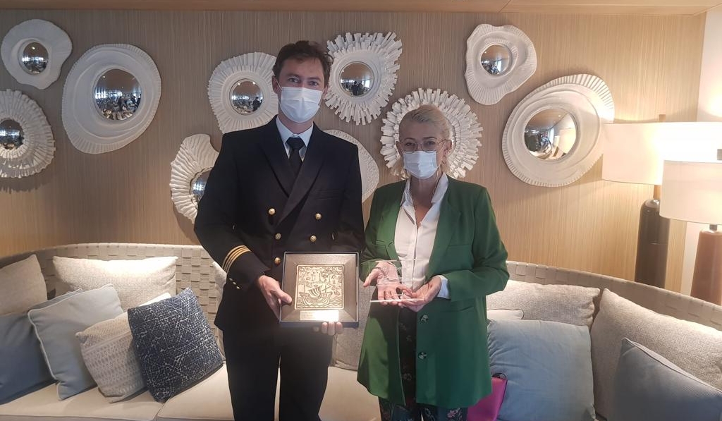 Con motivo de la escala del “Le Jacques Cartier” en la ciudad, la directora de Cruceros de la Autoridad Portuaria de Valencia, Francesca Antonelli, ha obsequiado a su capitán con una metopa.