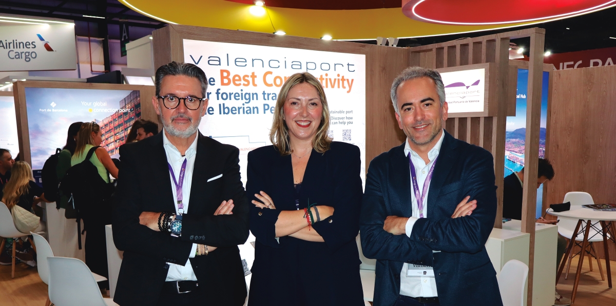 Miguel Garín, director de Desarrollo Internacional Fundación Valenciaport; Cristina Rodríguez, jefa de Contenedores y Cargadores de la AP de Valencia; y Jonas Mendes, delegado de la Fundación Valenciaport en Brasil. Foto J.P.