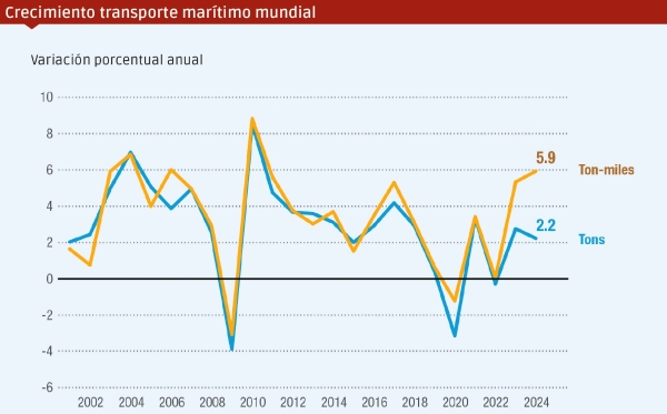 En 2024, el comercio marítimo mundial creció un 2,2% en volumen y un 5,9% en tonelada-millas, con perspectivas más moderadas para 2025, cuando se proyecta un alza de apenas 0,5% en volumen y un 1,4% en contenedores. A medio plazo, hasta 2030, la UNCTAD anticipa un crecimiento promedio anual del 2%, inferior al observado en las dos décadas anteriores.