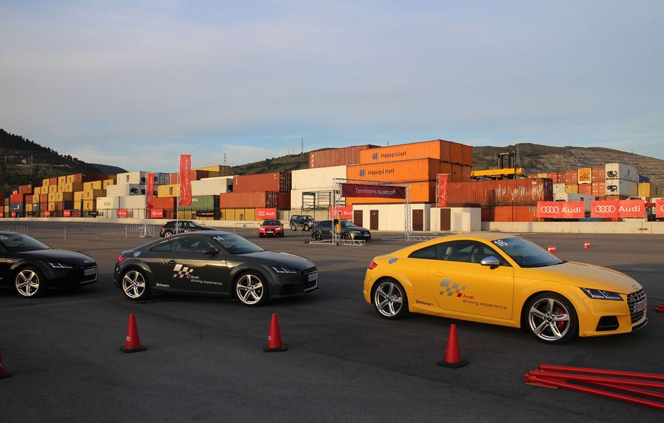 Los puertos valen para todo. En caso del Puerto de Bilbao, con miles de metros cuadrados de muelle aún desocupados tras la finalización de las obras de ampliación en el dique de Zierbena, la superficie libre es aprovechada para acoger actividades como la celebrada hace varios fines de semana por la firma Audi, que llevó a cabo en el muelle AZ-3 un curso para conductores que quieren aprender a dominar su vehículo en todo tipo de situaciones imprevistas, con frenadas súbitas, derrapes controlados, conducción en superficies deslizantes o distintos slalom de obstáculos, Los puertos valen para todo. Incluso para que los barcos carguen y descarguen sus mercancías. Foto J.P.