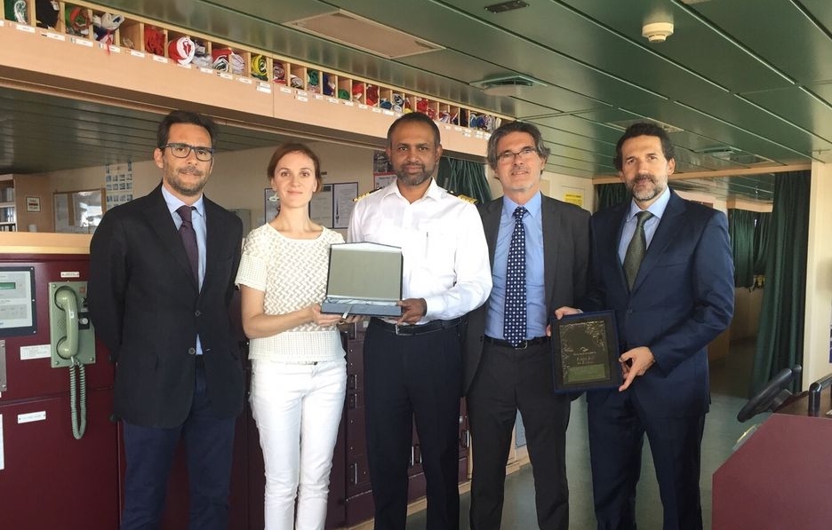 La naviera china se incorpora así al servicio regular IMU/MINA/ Amerigo Express operado por la naviera árabe UASC, la francesa CMA-CGM y la coreana Hanjin Shipping. Este servicio conecta el Puerto Bahía de Algeciras con el Subcontinente Indio, Oriente Medio y la Costa Este de los Estados Unidos. Tal y como adelantó Diario del Puerto, el buque de China Shipping que protagonizó la primera escala fue el “Buxcoast”, con capacidad para 5.360 TEUs y 73.000 tn.Representantes de China Shipping, la Autoridad Portuaria y TTI Algeciras estuvieron presentes en esta primera escala e hicieron entrega de la correspondiente metopa conmemorativa al capitán del buque. En la imagen, de izquierda a derecha, Nicolás Andión, jefe de la División de Desarrollo de la Autoridad Portuaria Bahía de Algeciras; Maribel Grau, directora Comercial de TTI Algeciras; el capitán del buque “Buxcoast”; Albert Oñate, director General de China Shipping Spain; y Javier López, jefe de la División Comercial de la APBA.
