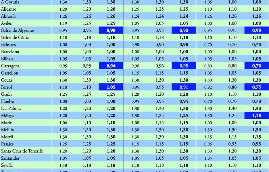Un total de 23 autoridades portuarias conservarán el año que viene sin cambios sus coeficientes correctores y tan sólo cinco aplicarán variaciones en los mismos, tres de ellas en todos los coeficientes y las otras dos únicamente en uno de ellos.Las dos variaciones más destacadas serán las de Bahía de Algeciras y Valencia.En el caso del enclave andaluz, en 2016 reducirá sus tres coeficientes en 5 centésimas para pasar de 0,95 a 0,90. Por su parte, Valencia aplicará una reducción significativa en el coeficiente de la tasa del buque, al reducirlo en seis centésimas y situarlo en 1,14.Menos relevante será la reducción en Cartagena de los coeficientes de la tasa del buque y de la mercancía, que bajarán apenas una centésima y quedarán en 0,94 y 0,95 respectivamente. En cambio, si es importante la bajada en el coeficiente de la tasa al pasaje, que se reduce una décima hasta situarla en el mínimo, 0,70.La otra autoridad portuaria que reducirá sus tres coeficientes en 2016 será Ferrol, que dejará el de la tasa al buque en 1,05 (cinco centésimas menos), el de la mercancía en 0,91 (cuatro menos) y el del pasaje en 0,75 (cinco menos).Málaga reducirá su coeficiente de la tasa al pasaje siete centésimas hasta el 1,18.Esto da como resultado que los coeficientes medios del sistema portuario estatal apenas vayan a sufrir variaciones el próximo año, manteniéndose en el 1,14 en el coeficiente de la tasa al buque y reduciéndose una centésima para el coeficiente de la tasa a la mercancía (1,13) y para la tasa al pasaje (1,02).La evolución en los últimos ejercicios ha sido mínima de tal forma que entre 2014 y 2016 un total de 20 autoridades portuarias habrán mantenido sus coeficientes correctores sin alteraciones.De cara al próximo año, de los 84 coeficientes correctores (3 por cada una de las 28 autoridades portuarias) sólo 4 estarán en el mínimo (0,70) y todos ellos para la tasa al pasaje en Baleares, Cartagena, Huelva y Tarragona.En cambio,hasta 14 coeficientes estarán en el nivel máximo (1,30), cuatro de la tasa al buque (Coruña, Ceuta, Melilla y Motril); seis de la tasa a la mercancía (Coruña, Ceuta, Las Palmas, Melilla, Motril y Santa Cruz de Tenerife); y cuatro de la tasa al pasaje (Ceuta, Las Palmas, Melilla y Tenerife).Las únicas dos autoridades portuarias con los tres coeficientes en máximos son Ceuta y Melilla.