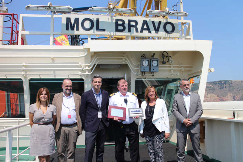 El Puerto de Barcelona dio ayer la bienvenida al buque "MOL Bravo", el segundo de los cuatro portacontenedores que de 10.100 TEUs de capacidad que la naviera MOL, representada en España por Transcoma, está introduciendo en el servicio. Sandra Esteban, directora comercial de TCB; Jordi Guirao, responsable de Operaciones de Transcoma; Jaime Paz, MOL Area Manager en España; Rosa Puig, directora comercial del Puerto de Barcelona, y Narcís Pavón, responsable de Operaciones de TCB, fueron los encargados de agasajar al buque y a su capitán, Volodymyr Syvettsev. Cada uno de los cuatro nuevos buques de MOL suponen un incremento de capacidad del 20% respecto a los buques que cubrían antes el servicio.