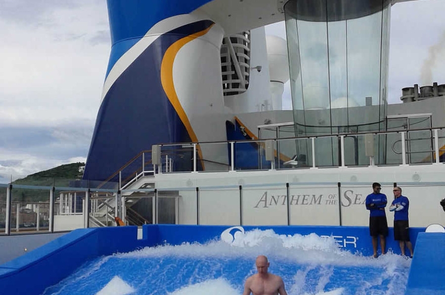 No hace falta ser un "beach boy" californiano para cabalgar las olas. Ni viajar hasta Hawai para aprender a hacerlo con los nativos. O a Bondy Beach, en Australia, para palidecer de envidia observando a los chicos y chicas que lo practican. Como tampoco es necesario ir a la cercana Mundaka, en la costa vizcaína, que presume de tener la mejor ola izquierda del mundo y recibe la visita de surfers californianos, hawaianos y australianos, deseosos de comprobarlo. En realidad, hoy en día ni siquiera es necesario el mar para practicar surf. Atracado en el muelle de Cruceros de Getxo, en el Puerto de Bilbao, el "Anthem of the Seas", el último coloso de la naviera estadounidense Royal Caribbean, es algo más que un barco de crucero. Es un auténtico parque de atracciones flotante. En su popa tiene instalado un generador de olas llamado "FlowRider" que permite la práctica de este deporte, aunque el joven de la imagen no parezca tener aún la habilidad suficiente para como ponerse de pie sobre la tabla. Pero además de practicar surf, escalada, conducir autos de choque o elevarse a más de 90 metros sobre el nivel del mar en una cápsula acristalada, en el "Anthem of the Seas" también se puede volar ya que equipa el primer simulador de paracaidismo en alta mar, el iFLY Skydiving, que aparece en la imagen como un tubo acristalado vertical situado tras el generador de olas. Afortunadamente, a pesar de todos estos atractivos irresistibles, la inmensa mayoría de los pasajeros optan por desembarcar en los puertos de escala y conocer las ciudades y el entorno cercano. Pero la tentación siempre se queda a bordo. Foto J.P.