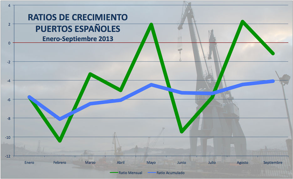 Pese al buen dato de agosto, cuando los tráficos crecieron un 2,25%, y a las perspectivas de cerrar el año en positivo, los tráficos portuarios alcanzaron en septiembre en los puertos españoles los 38,5 millones de tonelas, un 1,1% menos que en septiembre del año anterior, según los datos hechos públicos ayer por el Organismo Público Puertos del Estado.Este descenso, en todo caso, sirve para seguir mejorando el ratio de crecimiento acumulado, que viene incrementándose prácticamente desde febrero y que, tras el -4,43% hasta agosto, mejoró en septiembre hasta prácticamente el 4%, con un tráfico acumulado en los nueve primeros meses del año de 340,6 millones de toneladas, 14,4 millones menos que a esas alturas de 2012.Junto a los pasajeros de crucero, que crecieron hasta septiembre un 7,26%, el otro tráfico que sigue experimentando una mejor evolución es el de los contenedores import-export, que siguieron progresando en septiembre (+2,5%) para alcanzar entre enero y septiembre los 3,75 millones de TEUs y un crecimiento del 4,37%.Esta importante evolución permite compensar en parte el retroceso de los contenedores en tránsito, 5,44 millones de TEUs hasta septiembre que implica haber retrocedido desde enero un 5,5%. En septiembre, por ejemplo, la caída fue del 2,8%. El descenso del tránsito en volumen de mercancías en contenedores es aún mayor, pues hasta septiembre se registraron 70,3 millones de toneladas en este apartado, es decir, una caída del 9,15%.En total, el tráfico de contenedores en los puertos españoles ascendió hasta el tercer trimestre a 10,31 millones de TEUs, lo que implica una caída del 1,78%.PuertosPor puertos, es muy relevante ya la cota de Algeciras, que hasta septiembre logró crecer un 5,92% con 3,14 millones de TEUs. En lo más alto siguió situado en este tipo de tráfico la Autoridad Portuaria de Valencia, con 3,27 millones de TEUs y un descenso del 1,6%. También acumula retroceso Barcelona, en concreto un 2,9% con 1,28 millones de TEUs. El cuarto lugar lo ocupa Las Palmas, con 774.778 TEUs y, eso sí, un descenso del 16,3%. Bilbao, con 446.756 TEUs, descendió hasta septiembre un 1,35%.En el apartado de crecimientos destaca la Autoridad Portuaria de Castellón, con 143.945 TEUs y un incremento del 20,4%.